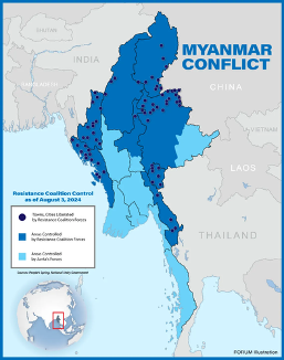 While the resistance has gained vital ground, the civil war in Burma has come to a standoff that favors neither side. The military junta’s forced conscriptions, attacks on civilian settlements, and history of ethnic repression and financial mismanagement have solidified resolve among the resistance. However, the fragmented resistance lacks a unified leadership or vision for a post-junta Burma, limiting the resistance’s ability to topple the regime. Indeed, a November 2024 report indicated that “neither the regime nor the key opposition actors appear willing to seriously negotiate” and that Burma will likely experience “continuing instability and a weakened government more willing to use violence.” Analysts predict the Junta’s latest effort to weaken the resistance and increase legitimacy – a general election in December 2025 – will likely increase tensions, with many opposition voices already claiming the election to be a sham.